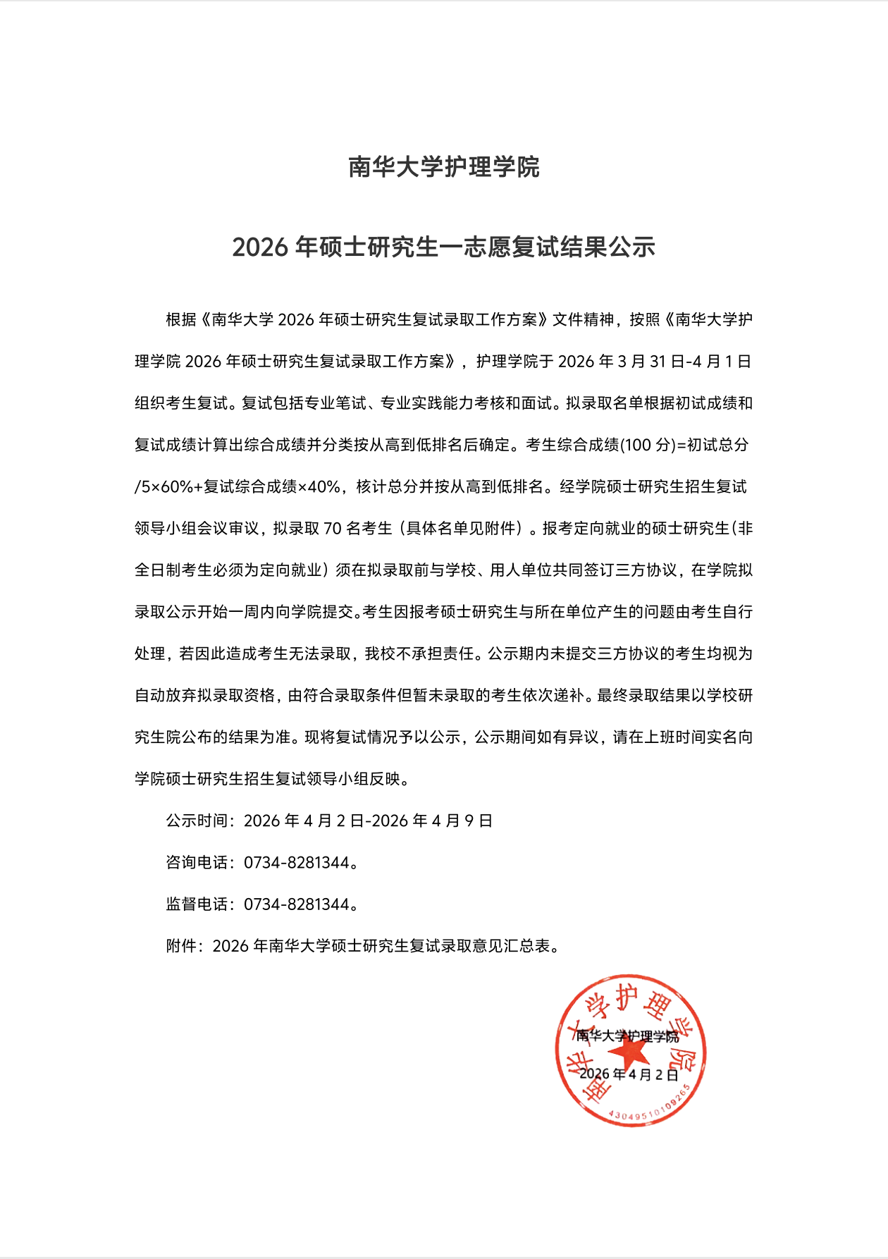 上一条:南华大学护理学院2026年硕士研究生招生调剂公告 下一条:2026年护理学院一志愿复试名单