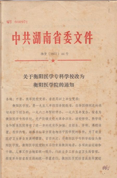 1977年7月26日,中共湖南省委《关于衡阳医学专科学校改为衡阳医学院的通知》。