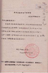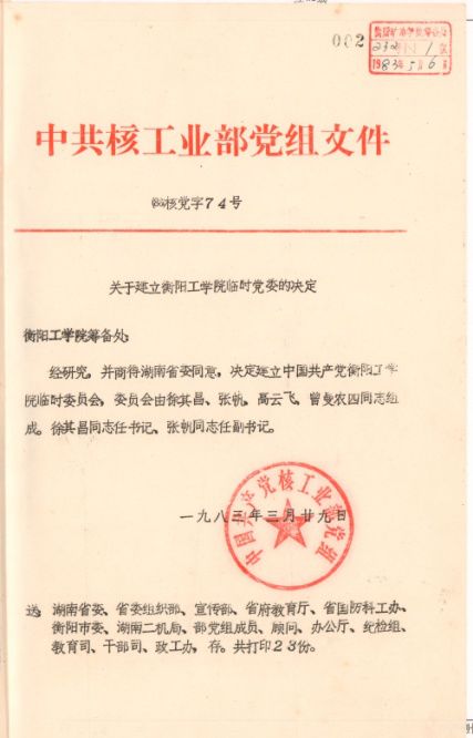 (1)湘政收文[1980]9号:1980年5月28日,二机部关于成立衡阳矿冶工程学院筹备处致函湖南省人民政府提出,为培养铀矿冶和其他科学技术人才,经征得你省同意,我部已报请国务院恢复衡阳矿院,待遇为地师级。