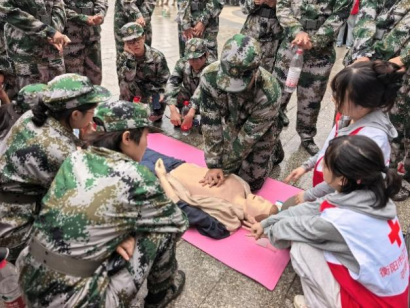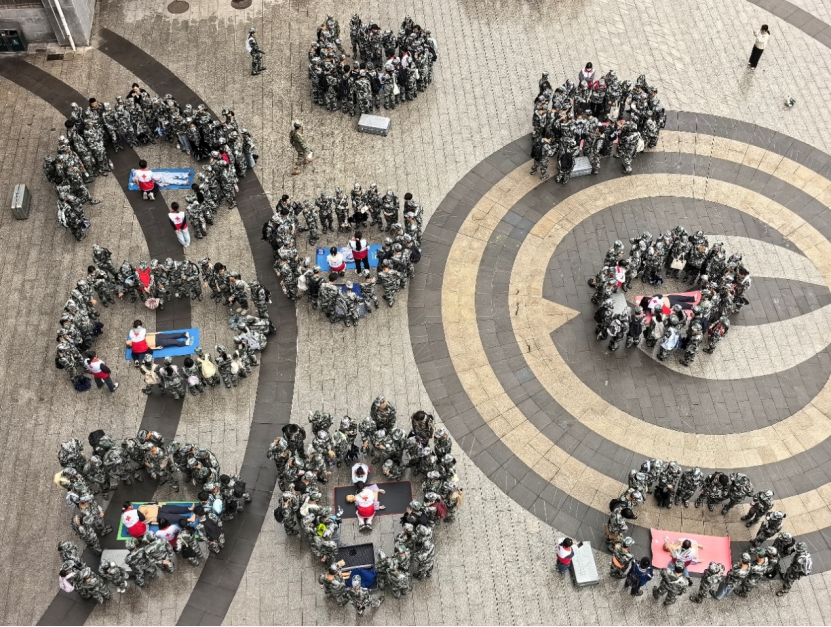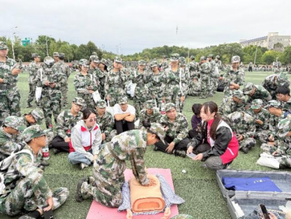 心肺复苏急救实操环节由护理学院40余名硕士研究生组成培训小分队,下到每一个军训连队,开展“一对一、手把手”指导。“手肘要伸直,借助上半身力量按压,看到模拟人胸廓起伏才算有效。”志愿者先示范标准动作,再逐一纠正新生操作细节,确保每人都能独立完成完整的心肺复苏流程。军训教官全程协同组织,保障培训高效有序推进。