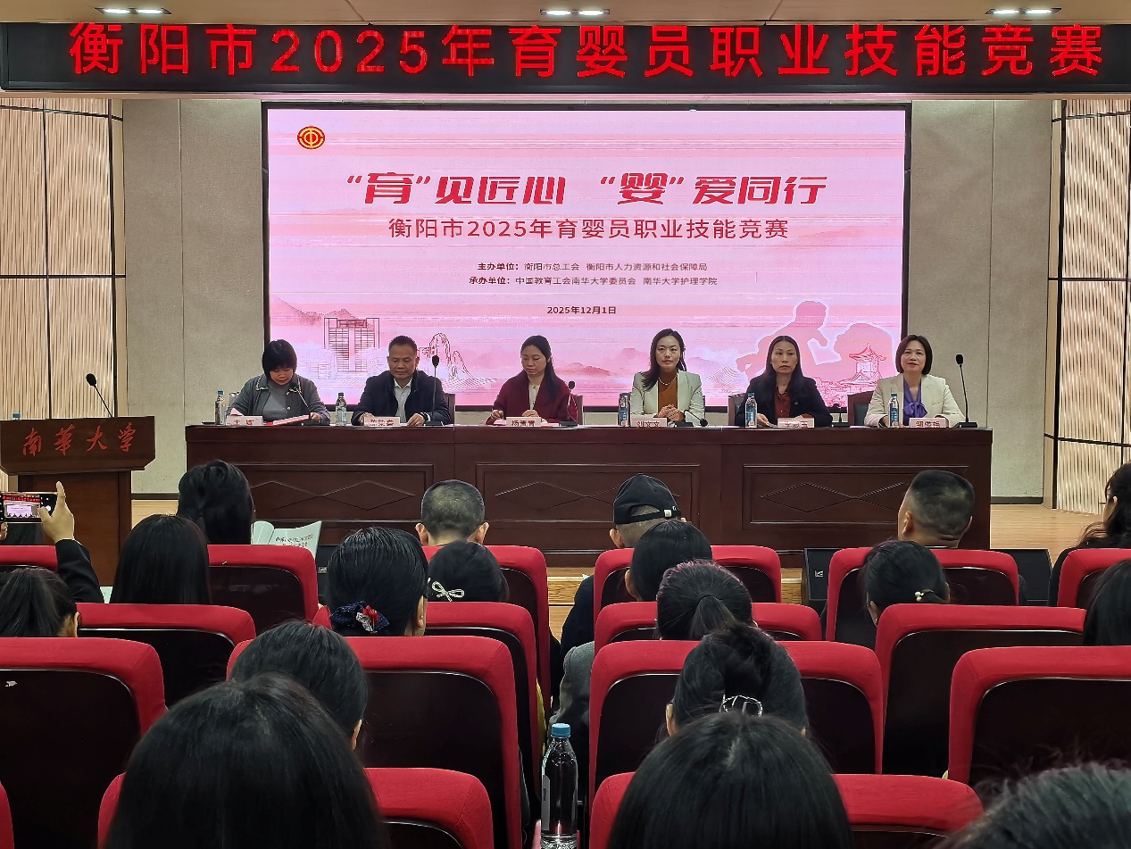 12月1日,衡阳市2025年育婴员职业技能竞赛在南华大学护理学院拉开帷幕。本次竞赛由衡阳市总工会和衡阳市人力资源和社会保障局主办,中国教育工会南华大学委员会和南华大学护理学院承办。来自各县市区的13支代表队、38名育婴员齐聚南华大学护理学院,通过同台竞技展现新时代育婴服务从业人员的专业素养与技能水平。