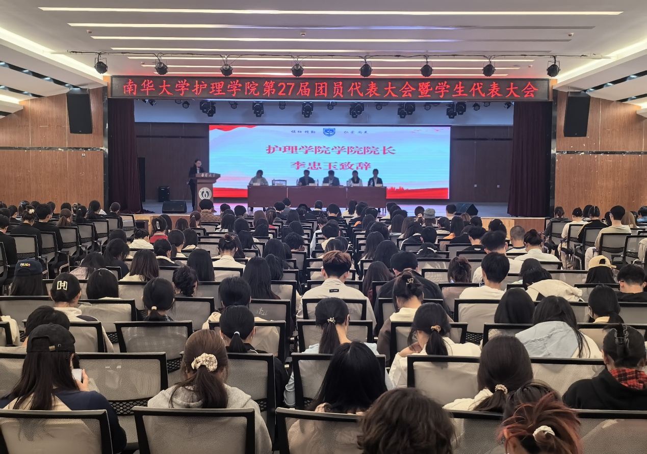 4月12日晚,南华大学护理学院第二十七次团员代表大会暨学生代表大会在红湘校区北校学生活动中心隆重召开。校党委学生工作部(处)李照部长、校团委禹敏副书记,护理学院李忠玉院长、曾谷清副院长、校学生会主席邓雨倩同学出席会议,学院全体辅导员、各学院团学干部代表、学院团员代表、学生代表300余人参加大会。会议由学院党委副书记王祥主持。