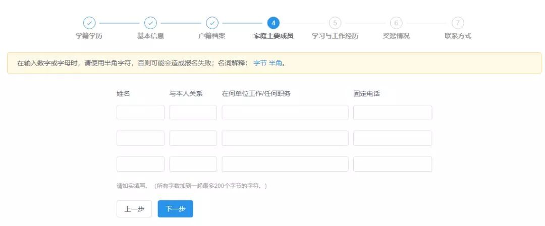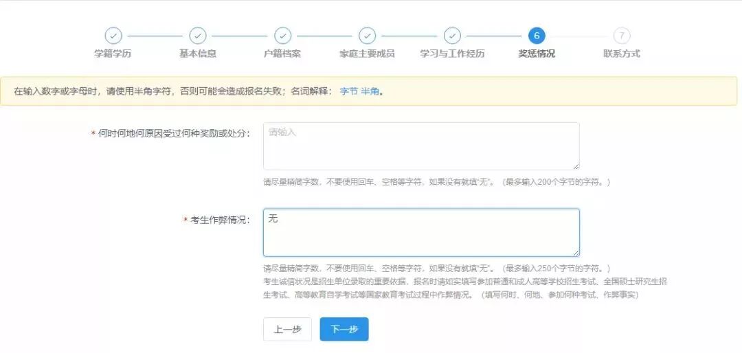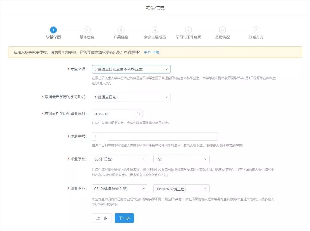 填写考生信息(学籍学历、基本信息、户籍档案、家庭主要成员、学习与工作经历、奖惩情况、联系方式)。填写考生信息时,请认真阅读报名页面的提示信息,准确填报,带*的文本框为必填内容,证件号码等使用半角英文输入法输入;考生填写学历(学籍)信息进行网上校验,考生可查看学历(学籍)校验结果,未能通过学历(学籍)网上校验的考生应在招生单位规定时间内完成学历(学籍)核验;家庭主要成员和学习与工作经历均至少要完整填写一项;