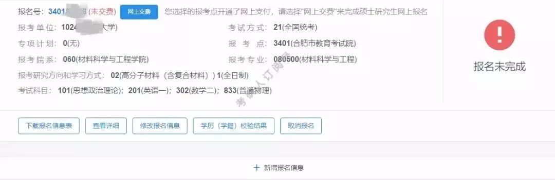 修改或查询自己的报名信息,其中招生单位、考试方式及报考点等信息是不可修改的内容;请在网报结束前登录确认所填信息,建议将所有信息保存;在需网上支付的报考点报考的考生请检查网上支付是否成功(银行卡扣费即为成功支付);